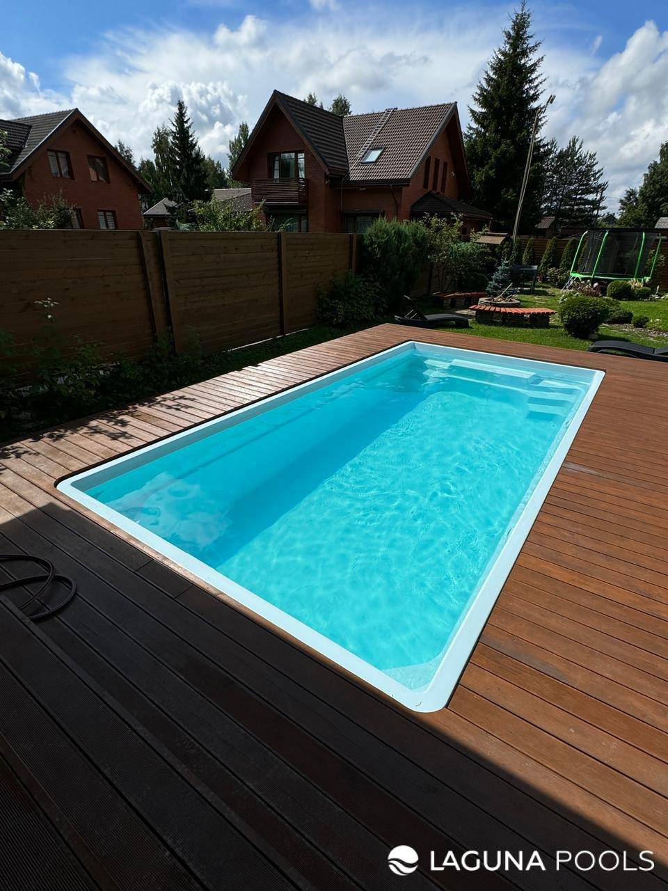 Композитный бассейн с голубой водой установлен на участке с деревянной террасой и зеленым газоном.